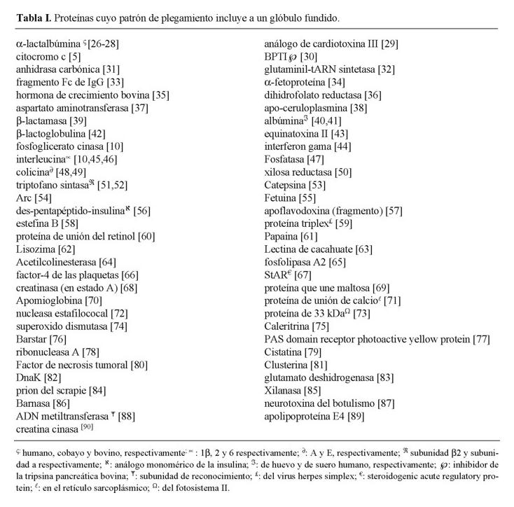 En la Tabla I se muestran 66 proteínas diferentes que poseen dentro de la vía de plegamiento al intermediario tipo GF; este número sugiere que el GF no es una rara excepción; por el contrario es probable que este intermediario sea típico para muchos tipos de proteínas en condiciones de desnaturalización discretas.