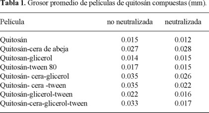 Determinación del grosor de las películas de quitosán compuestas. La Tabla 1, muestra el grosor de las diferentes películas no neutralizadas y neutralizadas.