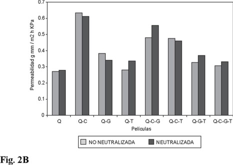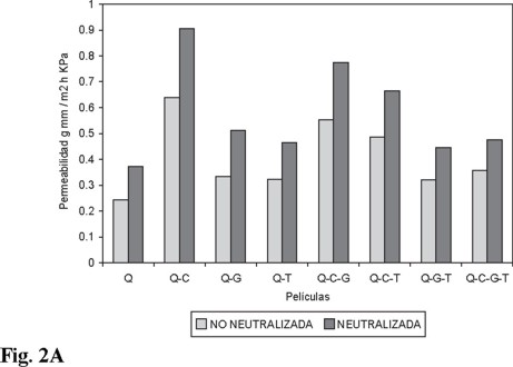 Se observa que las películas de quitosán no neutralizadas muestran el valor más bajo de permeabilidad con un valor de 0.3744 g mm / m2 h KPa.