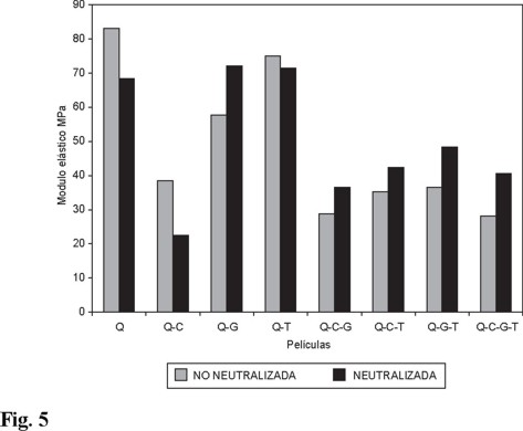 La figura 5 resume el comportamiento elástico de las películas de quitosán compuesto neutralizadas y no neutralizadas.