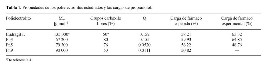 Preparación de los complejos. Los complejos de propranolol-polielectrolito fueron preparados siguiendo un procedimiento previamente reportado [4]: el propranolol·HCl (40 g) fue disuelto en agua destilada (200 ml). Esta solución es saturada a temperatura ambiente pero se disuelve a 37 °C, de esta forma se tiene la mayor concentración de propranolol disuelto posible. El poliácido correspondiente (Eudragit® L, de Helm de México y Pn3, Pn5 y Pn9 sintetizados) (10 g) fue disuelto en agua (200 mL) ajustando el pH a 7.4 mediante la adición de 1 N NaOH (excepto Pn9 que requirió un pH de 8.5 para su disolución completa). La solución de polímero fue adicionada lentamente a la solución de propranolol·HCl con agitación constante a 37 °C. El precipitado obtenido fue filtrado y lavado con agua destilada. El producto fue secado a 40 °C por 5 días, molido y tamizado por malla 100.