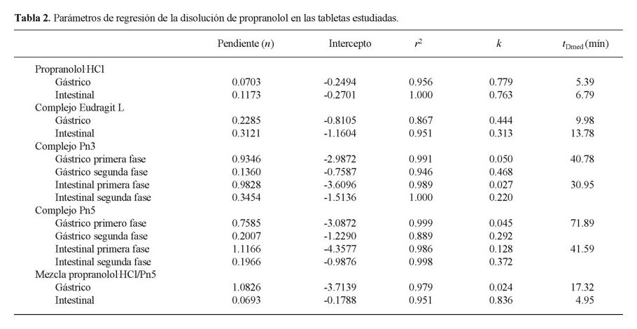 Al ajustar los datos a este modelo se observa un cambio en el proceso de liberación para los complejos con los polielectrolitos Pn3 y Pn5. En la tabla 2 se presentan los resultados de la regresión para las curvas de liberación en fluidos intestinal simulado y gástrico simulado. Como puede verse las tabletas de propranolol·HCl y el complejo con Eudragit® L no se ajustan a este modelo en ninguno de los medios, debido quizá a la rápida disolución del fármaco. En la primera fase de la disolución, se observa un valor de n cercano a 1 para el complejo con Pn3 en fluidos gástrico e intestinal, así como para el complejo Pn5 en fluido intestinal. Este tipo de cinética de liberación se observa cuando se combinan los mecanismos de intercambio iónico y disolución/erosión de cadenas del polímero [7,8]. El complejo Pn5 presenta un valor de 0.758 en medio gástrico. En este caso hay una influencia del proceso de difusión del fármaco debido a la formación de la barrera de polímero no ionizado. En la segunda fase el proceso de liberación no se ajusta al modelo en ninguno de los casos; esto se puede atribuir a que, en el caso del fluido intestinal, la barrera gelosa cambia su espesor con el transcurso del tiempo. En el caso del fluido gástrico se espera que el coeficiente de difusión no sea constante al incrementarse el tamaño de la barrera de polímero no ionizado a medida que avanza la disolución.