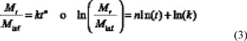 Los términos en esta ecuación son los siguientes Mt, la cantidad liberada a tiempo t; Minf, la cantidad total de fármaco liberada, k la constante cinética; y n, el mecanismo de liberación del fármaco. El valor de n varía entre 0.5 (dependiente del t1/2, difusión Fickiana) a 1 (representa el transporte Caso II, controlado por relajación). Valores de n entre 0.5 y 1 indican un comportamiento anómalo correspondiente a un acoplamiento entre difusión y relajación. Valores de n >1 se conocen como transporte Super Caso II.