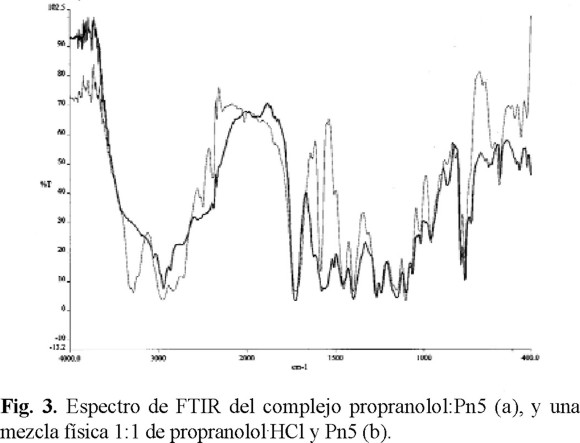 El espectro de FT-IR de los complejos, presenta una banda de absorción a 1555 cm-1, la cual no está presente en las mezclas físicas correspondientes. Esta banda ha sido asignada a las vibraciones autosimétricas de los grupos COO- resultantes de la formación de sal entre el propranolol y el polímero. La figura 3 presenta el espectro para el complejo y la muestra con Pn5 como ejemplo. Las señales en la mezcla representan las señales observadas en los espectros del propranolol·HCl y Pn5 puros, por lo que no se detecta interacción en la mezcla.