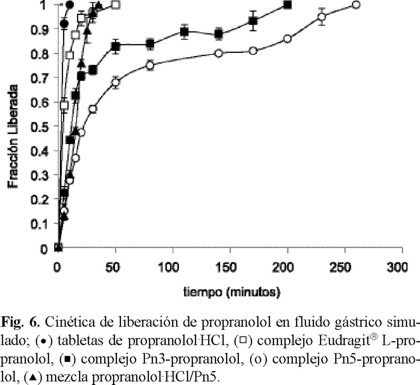 Estudios de disolución. Se prepararon tabletas de los complejos por compresión directa usando una prensa Carver a 3000 kg usando una matriz de 1.3 cm de diámetro. Cada tableta contiene una formulación con una cantidad de complejo correspondiente a 100 mg de propranolol base (50% del peso total de la tableta), celulosa microcristalina (15%), lactosa (29.3%) almidón glicolato de sodio (Explotab), 5% y estearato de magnesio (0.7%). Se prepararon también tabletas conteniendo una mezcla de propranolol·HCl (25%), Pn5 (25%) y el resto de los excipientes. Los estudios de disolución fueron realizados en 900 ml de fluido gástrico simulado (sin enzimas), pH (1.2) y fluido intestinal simulado, pH 7.4 (USP XXIII). Los estudios de disolución fueron realizados en un disolutor Sotax, usando paletas a 37 °C y 100 rpm. Cada prueba se realizó utilizando 3 tabletas. Las muestras fueron tomadas a tiempos predeterminados (5, 10, 15, 20, 30, 50, 80, 110 min). En algunos casos se ajusto el muestreo de acuerdo a los resultados previos. Las muestras fueron filtradas en filtros millipore de 0.22 µm. El contenido de propranolol en las muestras fue determinado por espectroscopía UV a 288 nm. La cantidad de propranolol utilizado por tableta permitió una evaluación adecuada de la liberación mantenido condiciones "resumidero" en el medio de liberación.