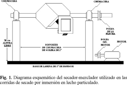 El secador utilizado fue diseñado y construido en el laboratorio del tipo mezclador de polvos aislado térmicamente y recubierto en su superficie interna con una placa de teflón de 3 mm. Este secador puede trabajar a diferentes velocidades de rotación y está dotado de una puerta con pasador de apertura rápida para la descarga de los sólidos al final de la corrida de secado. Un esquema del secador se presenta en la figura 1.