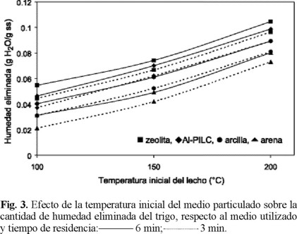 Con respecto al efecto de la temperatura de proceso, la figura 3 muestra que el incremento de la temperatura inicial del lecho particulado de 100 a 150 °C provoca un aumento promedio en la cantidad de agua removida del grano, equivalente a 1.8 y 1.4 veces la correspondiente a 100 °C, para los tiempos de residencia de 3 y 6 min respectivamente. Para la temperatura inicial del lecho particulado de 200 °C, el aumento promedio en la cantidad de agua removida del grano fue de 2.5 y 2.3 veces mayor que aquella a 100 °C para los mismos tiempos de residencia respectivamente.