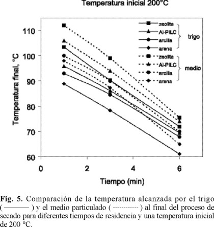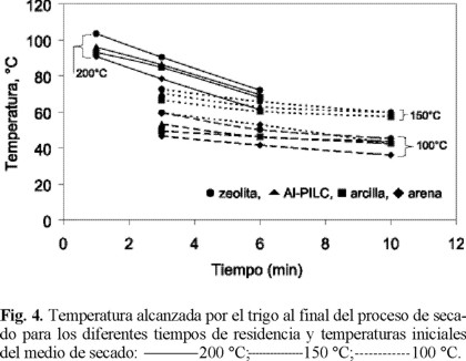 El trigo alcanza la temperatura más alta al final del proceso cuando es secado con zeolita, seguido por la Al-PILC, posteriormente arcilla y por último la arena en cualquiera de las condiciones de operación utilizadas.