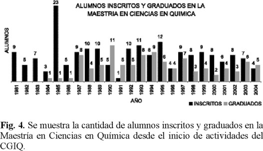 Hasta enero del 2004 han sido inscritos en el programa de Maestría en Ciencias en Química 191 alumnos, de los cuales 102 han obtenido el grado y quince se encuentran activos en docencia o desarrollando su trabajo de tesis (Fig. 4).