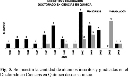 Los Estudios de Doctorado en Ciencias en Química se iniciaron en septiembre de 1992. En este programa se han inscritos treinta y cuatro estudiantes, de los cuales quince han obtenido su grado de Doctor en Ciencias en Química y actualmente se encuentran estudiando en este nivel otros diecisiete alumnos (Fig. 5).