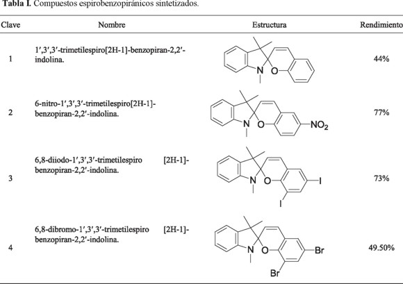 Los productos fotocromáticos obtenidos se purificaron mediante cristalización de metanol. De los cuatro compuestos fotocromáticos, se obtuvieron altos rendimientos (tabla 1), el espirobenzopirano con sustituyente nitro en la posición 6 presentó el valor más alto.