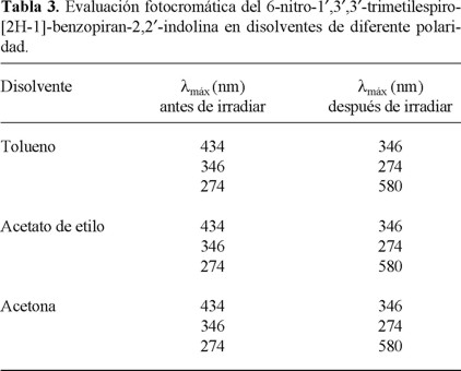 El efecto de la polaridad del solvente sobre las propiedades fotocromáticas del compuesto nitroespirobenzopiránico 2 se determinó espectrofotométricamente al emplear disoluciones 10-5 M de éste en tolueno, acetona y acetato de etilo, obteniendo resultados similares a los ya obtenidos en DMSO (tabla 3); sin embargo, al momento de realizar las disoluciones del compuesto en forma cerrada (antes de la irradiación), se observó el desarrollo de una ligera coloración en la solución, lo que indica cierto grado de solvatación; a mayor polaridad, mayor solvatación del compuesto 2.