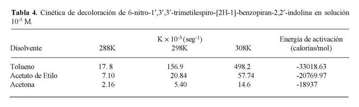 Es evidente el efecto que tiene la temperatura sobre la estabilidad de la merocianina según se observa en la tabla 4, presentándose un aumento en la constante de velocidad de reversión al estado incoloro al incrementarse la temperatura, independientemente de la polaridad del solvente, obteniendo las velocidades mas altas a 308 K.