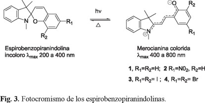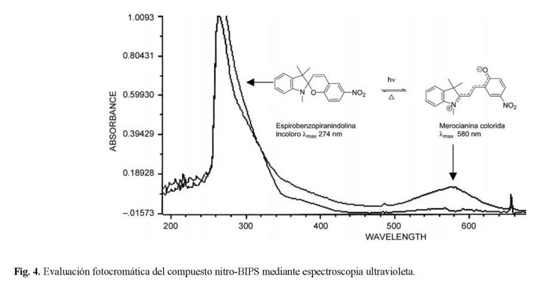 Para demostrar la eficiencia de los compuesto fotocromáticos, se evaluó la estabilidad de la fotomerocianina (forma abierta colorida) y su reversión a su forma cerrada (incolora) según se muestra en la reacción de isomerización (Fig. 3, Esquema 1).