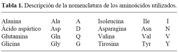 La secuencia 1 se tomó como base para el diseño de la biblioteca, para describir la presencia de un aminoácido se puede utilizar el nombre reconocido por la IUPAC (ácido 2-amino acético), el nombre genérico (glicina), tres letras (Gly) o con una letra mayúscula (G) como se muestra en la tabla 1.