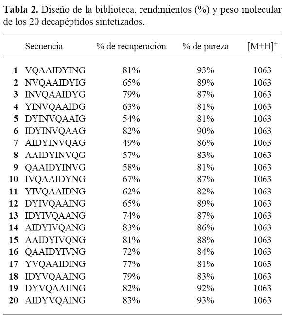 El tamaño de la biblioteca fue de 20 decapéptidos como se describe en la Tabla 2. De esta manera, conservando el mismo número y tipo de aminoácidos en el péptido original (1) se han modificado las posiciones. Así, el análisis de afinidad a metales y sus posibles variaciones dependerán de la posición de los aminoácidos en cada péptido sintetizado.