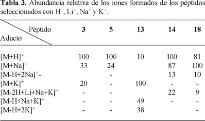 En el caso del péptido 3, es más favorable la formación de un aducto con Na+ (m/z 1085), que con K+ (m/e 1101), mientras que no existe afinidad alguna para Li+ (Tabla 3). Para el péptido 5, solamente se observa afinidad para Na+.