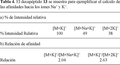 En el caso del péptido 13 (Figs. 3 y 4), el pico base es para el aducto formado con K+, el cual es 10 veces mayor que el ión cuasi-molecular [M+H]+. Asimismo, se presenta la formación de un aducto con dos iones metálicos diferentes de la mezcla (Na+ y K+), m/z 1123, en el que existe el desplazamiento de un protón, formándose el aducto [M-H+Na+K]+ con una sola carga. No se observó la formación de m/z 562, correspondiente a [(M+Na+K)/2]+. Además se observó la formación de un aducto con dos iones K+, [M-H+2K]+. Las relaciones de afinidad para el péptido 13 se presentan en la Tabla 4, observándose que existe una preferencia de más del doble para la formación del aducto con K+, que para la formación de aductos con dos iones metálicos. En este caso no se presentó afinidad alguna para Li+.