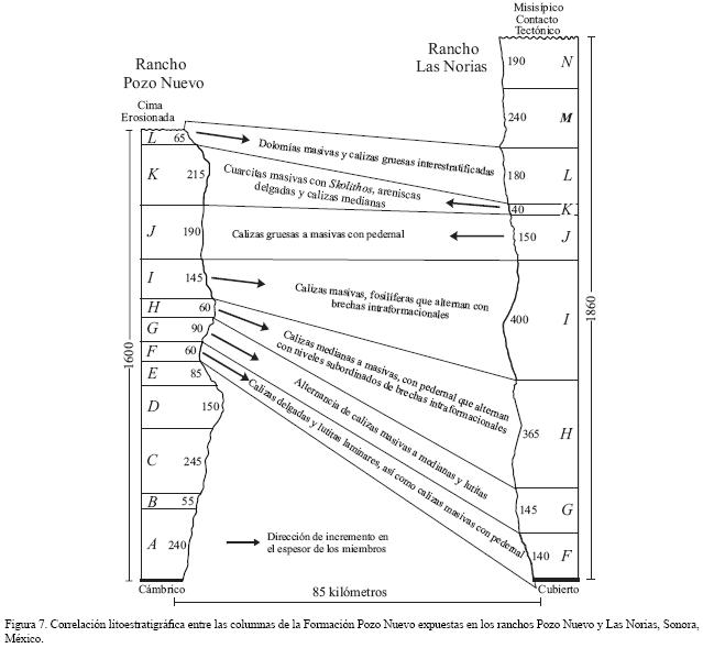 Desde el Rancho Pozo Nuevo al Rancho Las Norias existen notables variaciones de espesor en diversos miembros (Figura 7). Así se puede observar que, en los 85 km de separación entre los dos sitios, hay un aumento de espesor de la columna estratigráfica del Rancho Pozo Nuevo, con respecto a la del Rancho Las Norias. El Miembro F es superior en 230%; el Miembro G es un 161% más grande; el Miembro H es superior en 600% y los Miembros I y L rebasan un 275%. En contraparte, a medida que se asciende estratigráficamente en la columna de la Formación Pozo Nuevo, se observa un decremento en el espesor de los Miembros J y K, desde el Rancho Pozo Nuevo hacia el Rancho Las Norias, observándose en el primero una disminución en el espesor de un 21%; mientras que la reducción más notable ocurre en el Miembro K, que en el Rancho Las Norias se reduce hasta un 81.4%.