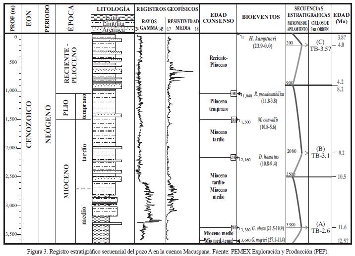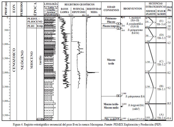 Durante el Neógeno en la cuenca Macuspana, la especie Reticulofenestra pseudoumbilica es un fósil índice que tiene su primera ocurrencia en ambos pozos, mientras que la especie Globigerinoides obliquus obliquus aparece estratigráficamente más abajo. La cima del intervalo Mioceno tardío está indicada por la ocurrencia de Minylitha convallis y Discoaster hamatus en el pozo A y el alcance estratigráfico total de Discoaster quinqueramus en el pozo B. Las especies de Globorotalia obesa y Globorotalia mayeri, ocurren en ambos pozos indicando una edad del Mioceno medio. La posición estratigráfica de estas especies en el pozo B varía ya que se tiene la primera ocurrencia de G. mayeri (11.4 Ma) y posteriormente ocurre G obesa (10.9 Ma).