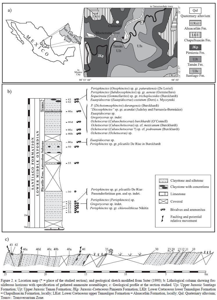 Close to the village of Tamán, San Luis Potosi (Figure 2a), the section studied herein corresponds to outcrops 57 to 60 of Reyes (1964) and later selected as the type section for the Santiago Formation (CantóChapa, 1969). The outcrop is situated along the left bank of the Moctezuma River and includes parts of the Santiago, Tamán, and Pimienta Formations. However, the combination of severe folding and faulting (well exposed along the mountain road to Chilocuil), together with soil coverage and dense tropical rainforest, makes precise recognition of a continuous succession of beds difficult. Thus, Figures 2b and 2c only show sedimentary packages that represent the lowermost part of the Santiago Formation accessible in the outcrop and containing successive ammonite assemblages. The interpretation of these is relevant in evaluating the significance of the covered intervals. We conclude that no major structural disturbance affected the section, which is 21.3 m thick and made up of dominant brownish claystones and siltstones, the latter including local calcareous concretions. Bed thickness varies between 20 and 50 cm.