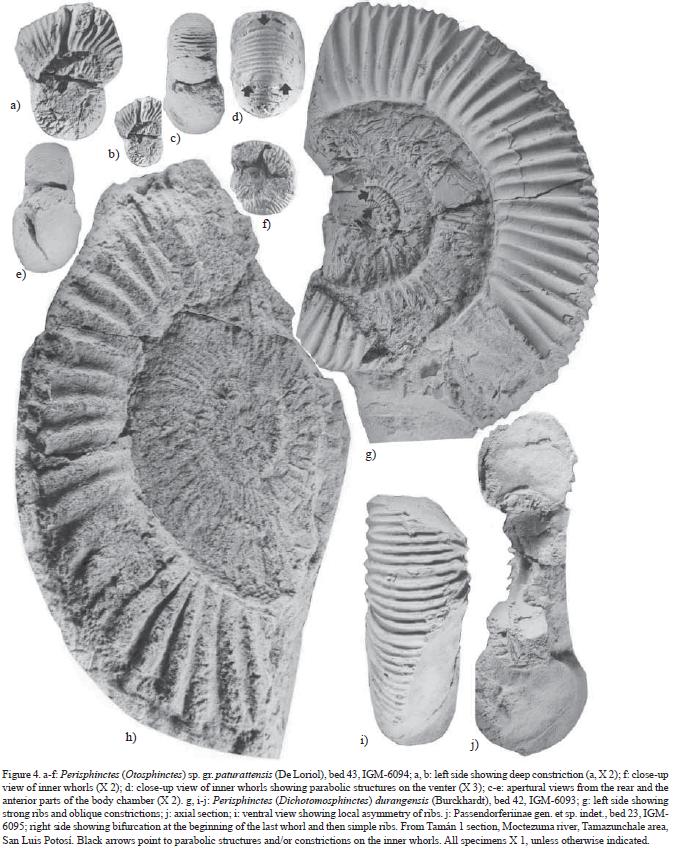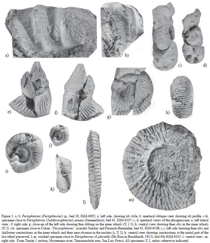 Occurrence. Otosphinctes species are reported from the Lower and Middle Oxfordian in Europe. Enay (1966), Bourseau (1977), and Meléndez (1989) interpreted the range of P. (Otosphinctes) paturattensis to embrace the lower part of the Middle Oxfordian, and the stratigraphic interval mentioned by these authors correlates with part of the Plicatilis Zone (Antecedens Subzone) in Cariou et al. (1991,1997). IGM6094 was collected from the uppermost bed 43 in the Tamán section (Figure 2), just above bed 42 that contains Perisphinctes (Dichotomosphinctes) durangensis (Burckhardt), Ochetoceras (Cubaochetoceras) and O. (C.) cf. mexicanum, and is interpreted to be from the Plicatilis Zone, Antecedens Subzone. It is most likely that the Otosphinctes sp. group of paturattensis (IGM6094) belongs to the same subzone in the Tamán section, but it may also come from the lowermost Transversarium Zone.