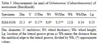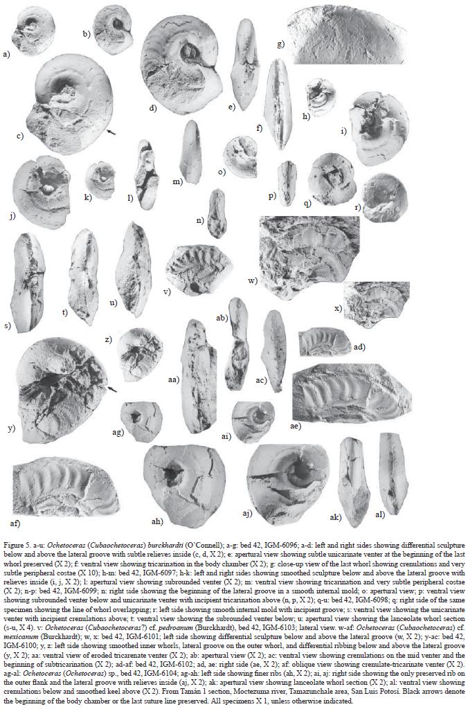 As mentioned above, precise description of specimens belonging to genus Ochetoceras is important for updating systematic interpretation at genus and species levels. For the purposes of this paper, we use the standard distinction based on the separation of mainly unicarinate versus "tricarinate" venters. The revision of Ochetoceratinae species from d'Orbigny's collection made by Enay and Gauthier (in Fischer et al., 1994) shows the incidence of homeomorphism in their systematic and biostratigraphic interpretations, and reinforces the needs for updated reinterpretations of ochetoceratins based on material collected bedbybed. Enay and Gygi (2001) recognized confusion in the usual interpretation of genus Ochetoceras. These authors proposed the use of genus Ochetoceras for unicarinate ochetoceratins and Neoprionoceras for tricarinate ones (Mexican forms included). However, until a combined revision of MexicoCaribbean and European ochetoceratins becomes available, we favor the use of Cubaochetoceras for tricarinate forms in the MexicoCaribbean area.