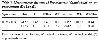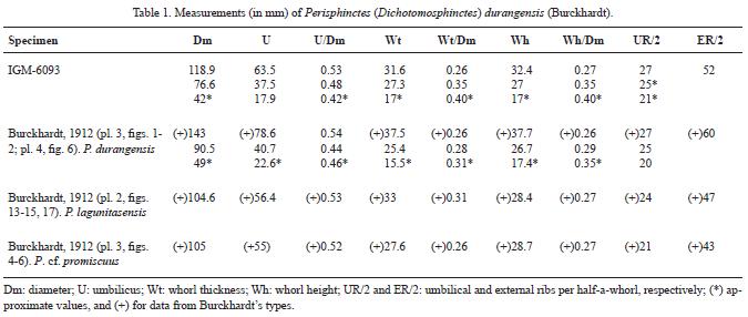 Discussion. Table 1 shows parametric relationships from smaller to larger sizes in the specimens included in the synonymy list. In addition, parametric relationships corresponding to Wt/Wh are the following: IGM6093 1 to 0.97; Perisphinctes durangensis Burckhardt (IGM417) 0.89 to 0.99; P. lagunitasensis Burckhardt (IGM416) 1.16; and P. cf. promiscuus Bukowski in Burckhardt (IGM419) 0.96. At the first sight, these values together with those in Table 1 indicate shared trends in shell morphology as well as occasional convergence (specimens with measurements obtained from a single diameter). The former is evident between IGM6093 and P. durangensis, both showing increased coiling, relative whorl thickness and whorl height throughout the ontogeny, resulting in shells with subovalsubrectangular whorl sections with flattened to slightly convex flanks and wide ventral regions. The small differences between IGM6093 at 42 mm and P. durangensis at 49 mm accord with the interpretation of IGM6093 as a slightly less tightly coiled juvenile with thicker and higher whorl section (e.g., a more robust shell). Their equivalent values at 110 mm and 143 mm, respectively, support the ontogenetic pathway in mature individuals belonging to a given morphotype or variety within a biospecies. Burckhardt's type of P. cf. promiscuus shows comparable values when the body chambers are >100 mm, but a slightly lower Wt/Wh (0.96 vs. 0.970.99), which reveals a more compressed phenotype. However, the lower Wt/Wh value might be evaluated taken into account the lower size in P. cf. promiscuus with respect to the larger IGM6093 and P. durangensis. In turn, P. durangensis shows values close to P. cf. promiscuus at 76 and 90 mm, while P. lagunitasensis represents a different morphotype, resulting from the relative inflation of the shell (observation for the body chamber only) without influencing coiling or whorl height.
