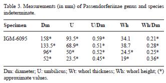 Description. Crushed specimen of at least 140 mm diameter and showing ellipsoidal deformation. The outer half whorl is preserved as internal mold, while the remaining identifiable whorls are imprints without vestiges of suture lines. A total of five whorls plus the nucleus itself are recognizable, despite the severe distortion and the virtual overlapping of successive whorls. The degree of coiling is approximately 55 percent, and whorl height increase is low (Table 3). Unfortunately, the ribs' counting within the umbilicus is obscured, but where preserved the ribs are fine, dense, and radial to slightly prorsiradiate. No rib bifurcation canbe seen within the umbilicus (but see below), which we interpret as resulting from peripheral division of ribs. Some cases of rib convergence near whorl junctions could reveal constrictions, and an excavated notch parallel to ribbing at approximately 15 mm diameter could be related to an edgereinforced constriction, which is typical of birmendorfensislike ammonites (Passendorferiinae). A rather abrupt change in ribbing seems to exist at the rear part of the outermost half whorl, but this could be a product of preservation. In this part of the shell, the only clearly bifurcate rib (division at the three quarters of whorl height) precedes what, on the basis of at least the last five to six ribs, seem to be simple, uniformly reinforced ribs that expand slightly towards their ventrolateral extremes. It is unclear whether any of these ribs are in fact partially obliterated bifurcates, but the last 11 elements are simple and presumably were conspicuous on the ventral shoulders, although the abovementioned expansion of the outermost extremes could be related to the combined effect of umbilical edge compression and shoulder extension.