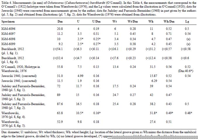 9) Judoley and FurrazolaBermúdez, (1968, p. 64,65) separated O. mexicanum var. cubensis from O. mexicanum because of the connected outer ribs [also present in O. (C) mexicanum; point 2] and the more distant inner ribs. At small shell diameters, these Cuban specimens seem barely distinguishable from the small phragmocone of Burckhardt's pedroanum. This is relevant to previous comments about forms related to O. (C) mexicanum.