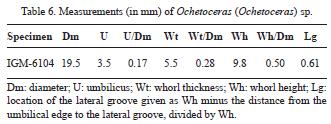 Description. In the specimen analyzed, approximately one third of the outer whorl belongs to the body chamber. Absence of crowded sutures indicates immature individual. The whorl section is highoval, with flanks arched below the lateral groove, and flattened and convergent to the venter above. Maximum whorl thickness is just below the lateral groove. The acute ventral region is slightly wider in the phragmocone and narrower in the body chamber, with persistent subrounded shoulders and crenulations early in the outer whorl. The umbilicus is moderately deep with subrounded umbilical edges and a steep umbilical wall. The sculpture is extremely subtle, difficult to observe, falcate, widely concave adorally below the lateral groove and more arched above; increased ribbing relief in the outerflank occurs towards the end of the preserved body chamber. The lateral groove is narrow, shallower in the phragmocone and shows small and discontinuous relieves that indicate the crossing of costae (Table 6).