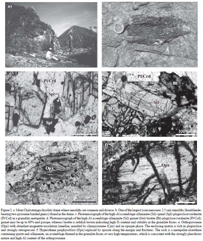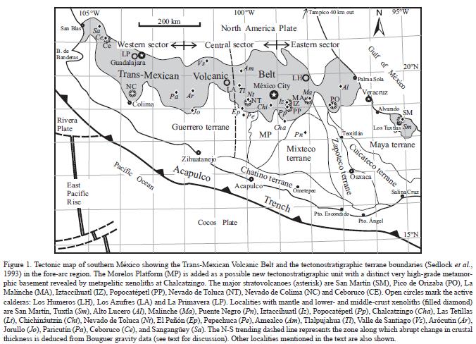 Xenoliths in the TMVB are common (Figure 1 and Table 3) but apparently most are of shallow origin except in five localities including three places with lower crustal mafic xenoliths (Valle de Santiago maars, Pico de Orizaba stratovolcano, and Amealco caldera), and two with mantle xenoliths (El Peñón, State of Mexico, and Alto Lucero, Veracruz). A summary of most important xenolith localities (18) in the TMVB is given in Table 3. On the other hand, deepseated crustal xenoliths in the forearc of southern Mexico are only known in three places, but none contain mantle xenoliths: Pepechuca, State of México (EliasHerrera and OrtegaGutiérrez, 1997; EliasHerrera, 2004), Chalcatzingo, Morelos (OrtegaGutiérrez et al, 2000) and Puente Negro, Puebla (OrtegaGutiérrez et al, 2004) (Figures 1 and 2). These forearc xenoliths differ from those in the TMVB because they consist mainly of granulite facies metapelites with common pyroperich garnet, sillimanite, rutile, spinel, corundum, cordierite, orthopyroxene, and FeTi minerals, whereas quartz and feldspars are less common, thus probably imparting a relatively high density (>2.8 g/cm3) to the buried forearc crust from which they were derived. Although many xenoliths in these places also originated in the deep middle crust under upper amphibolite facies, they consist of mafic, intermediate, and felsic gneisses and schists for which no exposures in the surrounding terranes are known. Granulite facies xenoliths can be distinguished by the presence of orthopyroxene in both mafic and metapelitic lithologies, rutilebearing quartz and the apparent coexistence of ultrahigh temperature assemblages such as spinelquartz and hypersthenesillimanite (Figure 2). This type of metamorphism is unknown elsewhere in Mexico, and could represent a rather unique Proterozoic crust in the TMVB forearc of southern Mexico that was sampled by the Cenozoic magmas piercing the Morelos Platform.