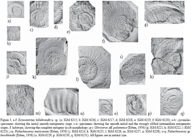 Description. Our 3 specimens are characterized by quite strong ribs already on the innermost whorls. The specimens correspond well to the concept of P. burckhardti (Erben) as presented by Meister et al. (2005). According to these authors, the inner whorls of this small species show a great variability in rib density and rib strength while the outer whorls bear coarser and more widely spaced ribs. This concept comprises 11 species of Erben (1956) from the «Echioceras burckhardti unit» sensu Erben, including P. burckhardti (Erben). The three specimens from Zongozotla are close to the morphology of «Echioceras (Echioceras) angustisulcatum Erben».