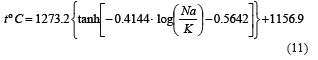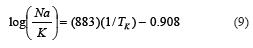 Si convertimos la temperatura absoluta (T) en grados Celsius (°C), la Ecuación 9 adopta la forma clásica del geotermómetro de Na/K, la cual será referida en este trabajo y para efectos de validación y comparación con otras ecuaciones geotermométricas como el geotermómetro TNK1DSR08 (esta y otras abreviaturas utilizadas para los geotermómetros fueron tomadas de Verma et al., en prensaa):