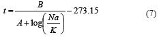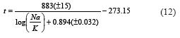en donde A y B representan los coeficientes de la regresión (ordenada y pendiente, respectivamente). Considerando que la temperatura absoluta T=t +273.15 y despejando la t (°C), se obtiene finalmente la ecuación clásica del geotermómetro de Na/K: