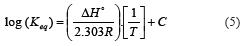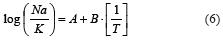 donde ΔH° es la entalpia de la reacción y C la constante de integración (dada por la relación entre la entropía de la reacción, ΔS° y la constante 2.3037R). Como ΔH° y ΔS0 presentan generalmente cambios muy pequeños con la temperatura en el intervalo de 0 a 300 °C, la ecuación de van't Hoff (Ecuación 5) permite evaluar la variación del log (Keq) con la temperatura. Esto se logra a través de la graficación del log (Keq) versus el inverso de la temperatura absoluta (1/T), la cual mediante una regresión lineal permite describir aproximadamente el comportamiento que exhiben las dos variables. Si se asume que la Keq puede ser aproximada por la relación de las concentraciones de Na/K (Ecuación 3), el comportamiento de ambas variables puede ser representado por la siguiente ecuación lineal:
