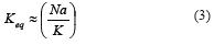 La aplicación de la Ecuación 2 usualmente adopta dos simplificaciones: (i) que los minerales albita (NaAlSi3O8)y microclina (KAlSi3O8) son fases puras y que por lo tanto, termodinámicamente sus actividades (αalbita y αKfeldespato) son iguales a la unidad; y (ii) que la relación de actividades de las especies disueltas Na+/K+ pueden ser equivalentes a la relación de concentraciones molares de Na/K (aunque las concentraciones de Na y K podrían ser también expresadas en otras unidades, p. ej., miliequivalentes, mg/L o mg/kg; ya que la relación Na/K es adimensional, generando en algunos casos un factor adicional relativamente constante). Con base en estas suposiciones, la ecuación de la constante de equilibrio (Keq) de la Reacción 1 se reduce a la siguiente expresión:
