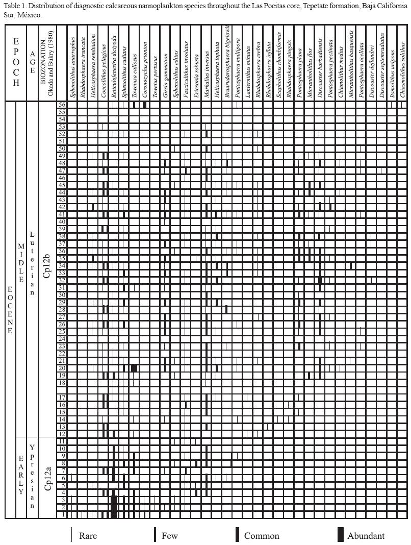 Taxonomic assignations of the calcareous nannoplankton recovered at the Las Pocitas core are based on PerchNielsen (1977, 1985), Bramlette and Sullivan (1961), Bramlette and Wilcoxon (1967), Bukry and Percival (1971), Gartner (1971), Sullivan (1965), and Wise et al. (2002). Sixty species belonging to 26 genera of calcareous nannofossils were identified. Calcareous nannoplankton was absent in the three upper samples of the recovered stratigraphic column, which otherwise might represent a younger unit instead of rocks belonging to the Tepetate formation.