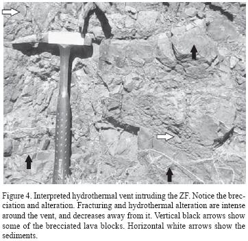 Primary sedimentary textures and composition of the ZF range from medium to finegrained sandstone and mudstone that contain a few conglomeratic layers and limestone lenses. Sandstones are quartz poor; feldspars and lithic fragments (plutonic, aphanitic and/or porphyritic volcanics) are rare to moderately abundant, and the matrix constitutes 26 to 70% of the rock. The shape of detrital components of the sandstones varies from subrounded to subangular. These rocks show a welldeveloped foliation defined by sericite. The thickness of individual strata is ≤50 cm, although the real thickness is difficult to define because the contact between sandstone and mudstone is commonly obliterated by foliation and/or weathering. The sedimentary succession of the ZF includes rare conglomeratic or conglomeratic sandstone layers that can be matrix or clast supported, with maximum thickness of ~40 m. The clasts are composed of quartzite and oxidized and/or silicified volcanic rocks(?). The clasts range in size from 1 cm up to ~5 cm, but occasionally can be as large as 30 cm in diameter. Limestone, sometimes folded, has also been identified in the ZF. Intercalated lava flows and probably also tuffs can be observed within the ZF. The presence of tuffs is not clear because the strong foliation and hydrothermal alteration obscure the primary structure and texture of the rock. However, we infer its presence from the existence of some broken euhedral to subhedral feldspar crystals in the sandstones. The lava flows are less foliated than the sedimentary rocks because of to their higher competence. The thickness of the lava flows can not be clearly defined because of the foliation, but it appears to be up to ~50 cm in some places. The lavas are porphyritic with argillitized plagioclase phenocrysts less than 1 mm in length. Chlorite is concentrated in the mafic minerals (clinopyroxene and olivine ?) and in the mafic phases(?) in the matrix. Hydrothermal epidote is also present. Pillow structures in lava flows, enclosing clastic sediments between the individual tubes are still present, indicating a submarine extrusion. Along the Arroyo El Bote, close to the type locality, the presence of a hydrothermal vent (see location in Figure 2) is suggested by horizons of brecciated quartz, lava blocks and sediment fragments in an aphanitic matrix (Figure 4). Plagioclase phenocrysts are also present in the matrix. Pervasive silicification and intense fracturing is observed around the vent, and some fractures are filled with hematite and magnetite. The intensity of fracturing and alteration decreases with increasing distance from the vent. Close to the vent there is a lava flow concordant to the sedimentary units of the ZF, which we interpret as related to the vent, suggesting that the volcanic activity took place during the deposition of the basin sediments. The vents are associated with the lava flows interbedded with the sediments. The lavas (Figure 4) are thin and some of them show pillow structures.