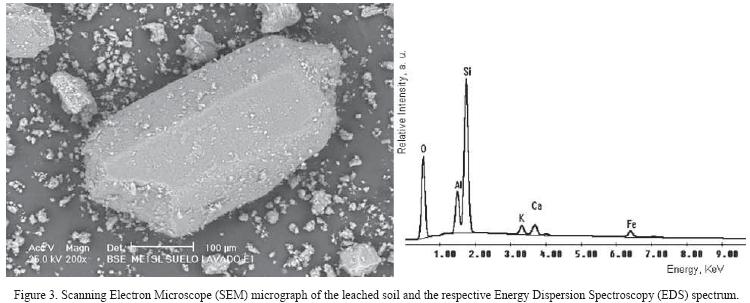 The morphology of the soil particles contaminated with chromium, of the leached soil, and of the chromium precipitates were analyzed in a scanning electron microscope Phillips XL30 at 25 kV. The samples were mounted on an aluminum holder with a carbon conductive tape, and later covered with a gold layer, approximately 200 Å in thickness, in a Denton Vacuum Desk II sputtering system. Prior to scanning, the fresh prepared soil particles were dried at room temperature for a week. In all cases, the images were taken with a backscattered electron detector. The elemental composition of the same samples was determined by Energy Dispersion Spectroscopy (EDS) with an EDAX DX4 spectrometer; to obtain the Xray spectra, a count rate of 2000 to 2500 cps, dead times of 2530 %, and a 150 seconds acquisition time was used.