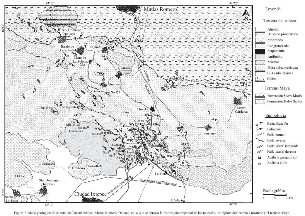 La zona de estudio (Figura 2) está caracterizada por una secuencia formada por anfibolitas y serpentinas con protolitos ígneos volcánicos y subvolcánicos, y filitasesquistos (pelíticocalcáreos) que presentan un metamorfismo de bajo grado y una deformación importante, que ha sido definida como terreno Cuicateco (Sedlock et al., 1993). A esta secuencia la cabalgan secuencias de caliza con estratos gruesos, ligeramente plegadas y con un contenido importante de rudistas de edad albiana (Sellea sp. y Pacytraga sp.; Carfantan, 1985). La secuencia metavulcanosedimentaria está intrusionada por cuerpos de monzonita, y está sobreyacida por depósitos piroclásticos de composición riolítica de 16 Ma (Williams y McBirney, 1969). En la porción sur del área se ubican las rocas más jóvenes: un conglomerado polimíctico y depósitos aluviales, producto de la erosión de las rocas preexistentes. Al norte, en las inmediaciones de Matías Romero, afloran conglomerados, areniscas y limolitas de carácter continental relacionados a la Formación Todos Santos (Terreno Maya; Herrera y Estavillo, 1991), así como calizas de la Formación Sierra Madre (Quezada, 1978). El límite entre los terrenos Cuicateco y Maya es de tipo tectónico y está definido por un sistema de fallas inversas bien representado por la falla Vista Hermosa (OrtegaGutiérrez et al., 1991). La distribución de las unidades litológicas de ambos terrenos se muestra en la Figura 2, y se describen a continuación en orden estratigráfico.