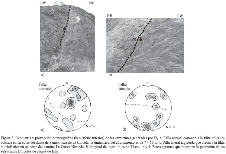Las características de la D1 definen un régimen de deformación principalmente dúctilfrágil que tuvo una relación directa con el metamorfismo en facies de esquistos verdesepidotaanfibolita. El evento responsable de esta deformación podría ser un desplazamiento transcurrente sinistral, evidenciado por lineaciones de estiramiento subhorizontales, que indican un desplazamiento lateral izquierdo sobre un plano vertical de S1 que posteriormente fue plegado por D2. Sin embargo, la edad de este evento no fue determinada; VilaGómez (1977) obtuvo por el método KAr en roca total (filita) una edad de 82.5 Ma, Campaniano inferior, que Carfantan (1985) relacionó con la edad del metamorfismo.