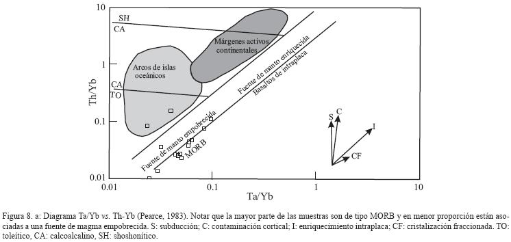 Al implementar el diagrama de discriminación Ta/Yb vs. Th/Yb de Pearce (1983) se observa que la mayor parte de las muestras están claramente asociadas a la fusión parcial de una fuente empobrecida del manto, como es común encontrar en basaltos formados en dorsales oceánicas (MORB), mientras que dos de las muestras (Nz0104 y Nz1304) tienen una afinidad más acorde con arcos de islas oceánicas (Figura 8).