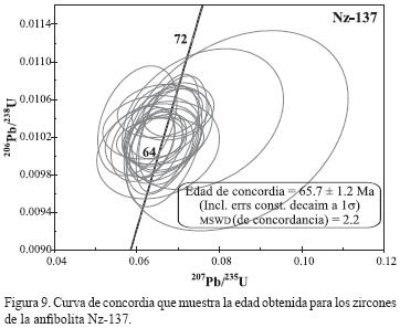 Los zircones de la anfibolita (Nz137) presentan un color rosa claro iridiscente con geometría bipiramidal elongada. Las imágenes de catodoluminiscencia sugieren que algunos de los cristales muestran zonación magmática. De esta muestra se realizaron 24 análisis que tuvieron un error sistemático de 1.6%, los datos obtenidos se muestran en la Tabla 2. La edad de concordia obtenida para esta muestra indica una edad de cristalización en el límite Maastrichtiano Campaniano con zircones de 65.7 ±1.20 Ma (Figura 9).