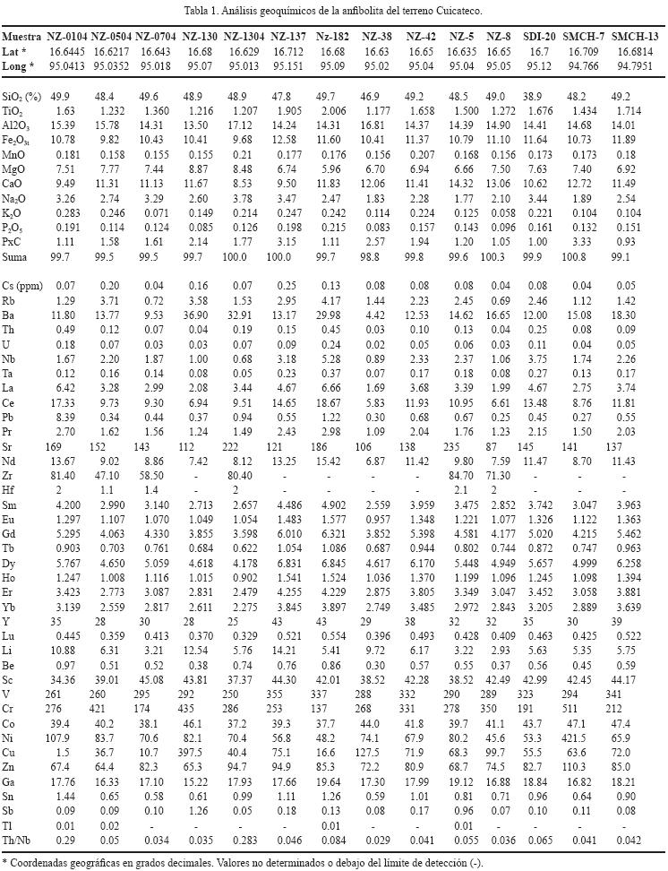 Los análisis geoquímicos se realizaron en 14 muestras de anfibolita (Tabla 1). Los elementos mayores fueron analizados por Fluorescencia de Rayos X (XRF), siguiendo la metodología de Lozano y Bernal (2005), mientras que las concentraciones de los elementos traza se determinaron con un Espectrómetro de Masas de Plasma Acoplado por Inducción (ICPMS) en el Instituto de Geología y en el Centro de Geociencias de la UNAM, de acuerdo a la metodología reportada por Mori et al. (2007).