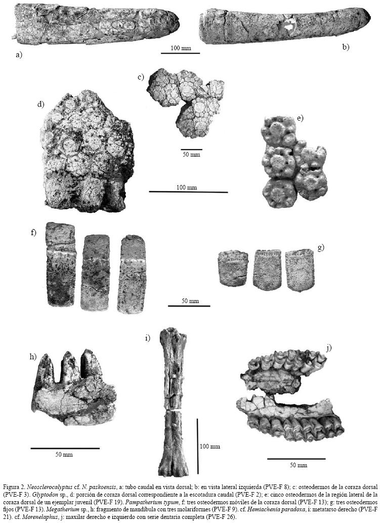 Material referido. Porción de coraza correspondiente a la escotadura caudal compuesta de 16 osteodermos (PVEF 2); fragmentos de molariformes (PVEF 7); tres osteodermos de la coraza dorsal (PVEF 10); osteodermos de la coraza dorsal y de la escotadura caudal de un individuo juvenil (PVEF 11).