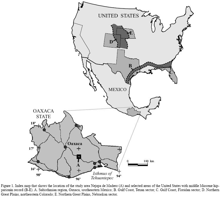 The horse material comes from fossiliferous localities that lie in the Nejapa de Madero area (hereafter Nejapa), northwest of the Isthmus of Tehuantepec, roughly midway between the cities of Oaxaca and Tehuantepec, and geographically located between 16°30'16°40' N and 95°55'96°10' W (Figure 1).