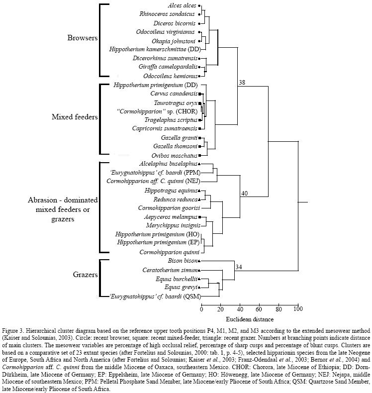 The mesowear analysis was performed using as a comparative set 23 extant species reported with typical dietary preferences (after Fortelius and Solounias, 2000, tab.1, p. 45) and the fossil populations of North American, African and European hipparionins Hippotherium kammerschmittae from the late Miocene (Turolian) of DornDürkheim, Germany (Kaiser et al., 2003, 2004); the populations of H. primigenium from Höwenegg (Vallesian), Eppelsheim (Vallesian) (Kaiser, 2003), and DornDürkheim (Turolian), late Miocene of Germany (Kaiser et al., 2003); "Cormohipparion" sp. from the late Miocene of Ethiopia (Bernor et al., 2004); the populations of 'Eurygnathohippus' cf. baardi (Quartzose Sand Member and Pelletal Phosphate Sand Member) from the late Miocene/early Pliocene of Langebaanweg, South Africa (FranzOdendaal et al., 2003); Merychippus insignis from the middle Miocene (early Barstovian) of Nebraska, United States (Fortelius and Solounias, 2000); Cormohipparion goorisi from the middle Miocene (early Barstovian) of Texas, United States (Fortelius and Solounias, 2000); and Cormohipparion quinni from the middle Miocene (late Barstovian) of Nebraska, United States (Fortelius and Solounias, 2000). It is regarded that dietary preference for each species considered other than Cormohipparion aff. C. quinni has been evaluated applying the mesowear analysis.