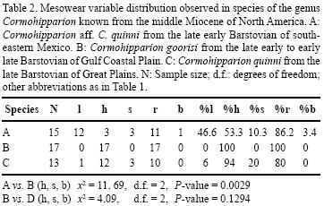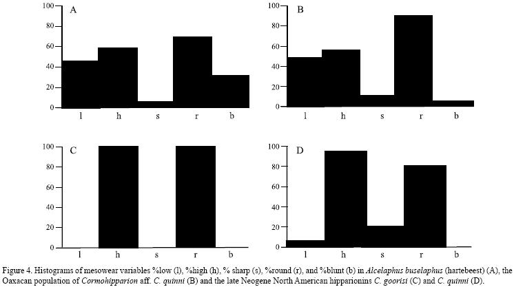 Significant differences between the mesowear variables (high, sharp, and blunt) obtained for Cormohipparion aff. C. quinni, the hipparionin C. goorisi, and the extant grazer Alcelaphus buselaphus were found (x2, P<0.05). Low levels of significance, however, were found when a comparison was made between the Oaxacan hipparionin population with C. quinni (P = 0.1294) and the population of 'Eurygnathohippus' cf. baardi from Pelletal Phosphate Member. Histograms of the mesowear variables for Cormohipparion aff. C. quinni and C. quinni (Figure 4) show the similarities in their mesowear pattern, by having a combination of relatively high relief and round cusps.