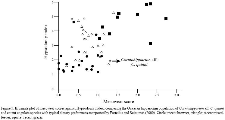 Figure 5 shows a plot of the hypsodonty index versus the mesowear score (hypsodonty indices as reported in Fortelius and Solounias, 2000; mesowear scores from data reported in Rivals and Semprebon, 2006) for selected extant ungulates and the fossil population considered in present study. The mesowear score for the Oaxacan hipparionin population of Cormohipparion aff. C. quinni (1.3) falls within the range observed in extant abrasiondominated mixed feeders and fresh grass grazers, whereas the calculated hypsodonty (1.9) places this species with extant mixed feeders with high abrasion mesowear pattern and diets and away from modern extant browser which are rarely hypsodont.